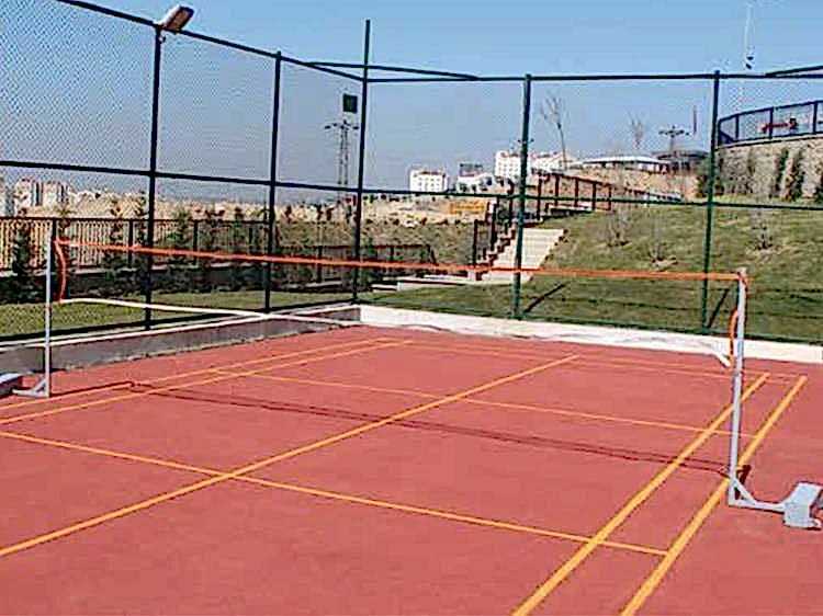 - Akrilik veya EPDM zemin kaplaması yapılır ve oyun çizgileri çizilir.